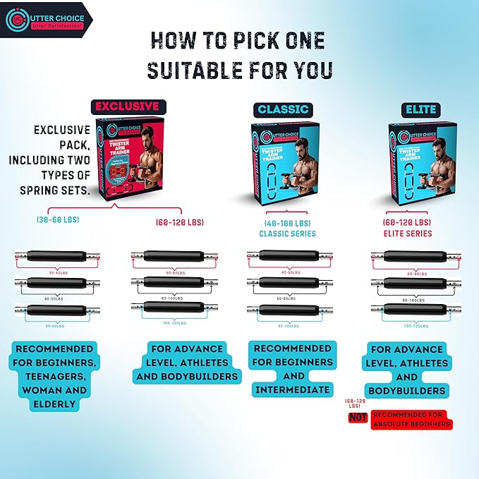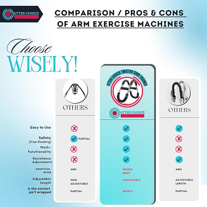 - π PROFESSIONAL-GRADE ARM AND CHEST STRENGTH TRAINER FOR MEN β UTTER CHOICE Twister Arm Trainer for men delivers 40-100lbs adjustable resistance to sculpt chest, arms, shoulders & back simultaneously! Includes step-by-step workout poster for perfect form Works biceps, triceps, abs & thighs. UTTER CHOICE Chest Exerciser for Men Superior to traditional dumbbells for full upper-body engagement. Our Chest workout device is ideal for home gyms & athletes.