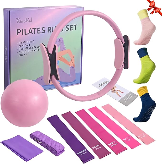 - Complete Set: Includes two premium Pilates rings (14 inches), 1 fitness ball, 5 resistance bands, 1 pull-up band, 1 yoga stretch band, and 3 pairs of yoga socks—enabling you to enjoy a comprehensive workout experience.