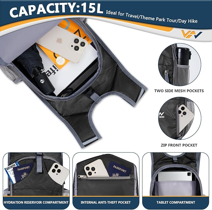 - ✅【SPACIOUS WITH MULTIPLE POCKETS】Our 15L Foldable Backpack features multiple compartments for easy packing and organization to accommodate clothes, books, snacks, travel essentials needed for day hikes.This small hiking backpack has one open pocket in the center available for flexible access to items and two mesh side pockets for water bottle or umbrella. The internal pocket provides a secure storage for your wallets, phones, cards or keys.