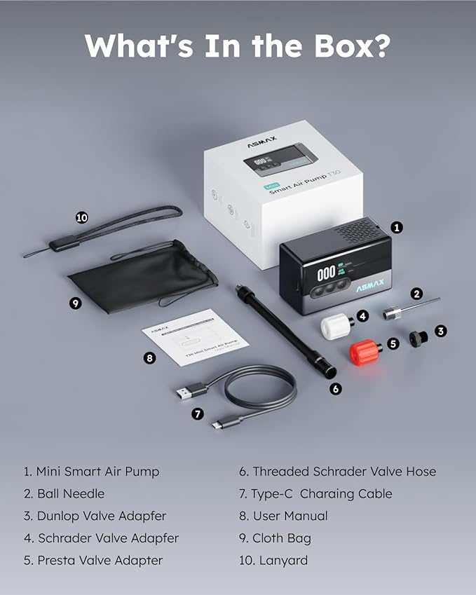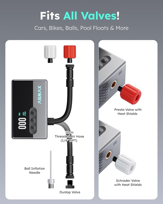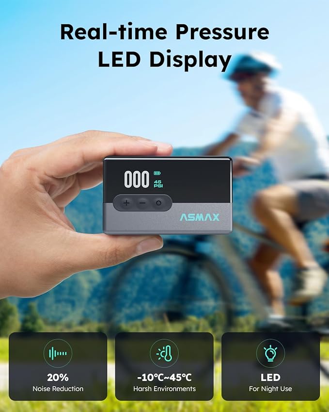 - 【4-in-1 Multi-Tool: Pump, Gauge, Light & Ball Needle】Includes ball needle and nozzle set for inflating basketballs, soccer balls, and more. Also functions as a pressure gauge, LED flashlight, and quiet compressor (≤80dB at 1.5m). Works from -10°C to 45°C in any weather.
