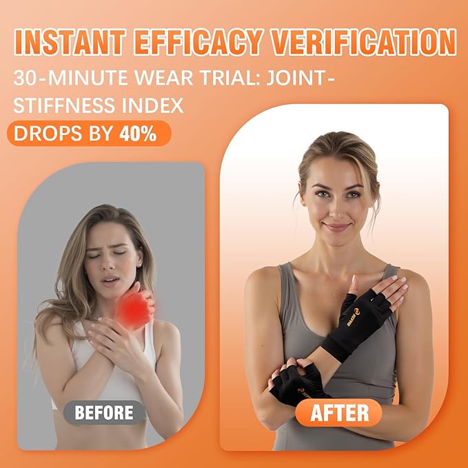 • Suitable for any daily activity—whether work, study, household chores, or outdoor pursuits. Relieves morning stiffness discomfort; assists in reducing nighttime inflammatory responses; alleviates various hand pains during daily activities such as finger arthritis, carpal tunnel syndrome, tenosynovitis, trigger finger, and swelling; eases vibration pain from gripping a tennis racket