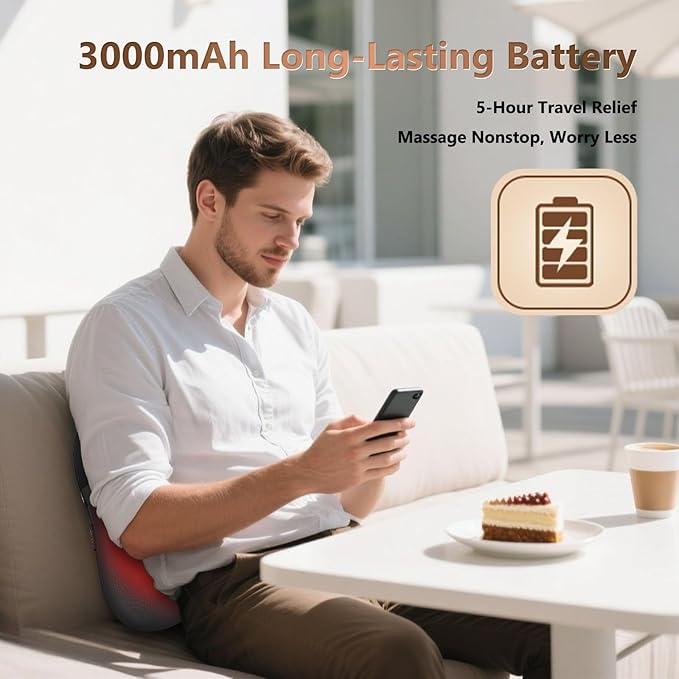 - 【Cordless and Large Capacity 】This back massager with heat features a wireless design with a robust 3000mAh battery, delivering ultimate convenience and freedom of movement. No more tangled cords or anxiety about short usage times - easily bring this shoulder and back massager anywhere. Whether you're recovering from workouts or managing chronic discomfort, it therapeutic kneading and heat therapy provide effective relief for a rejuvenated body.