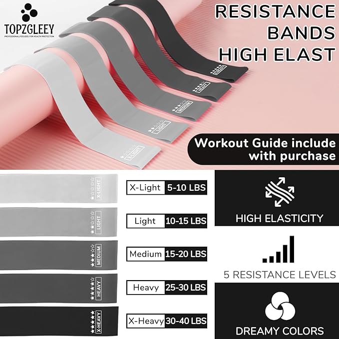 - Multiple Uses High End Exercise Bands; This Resistance Band Set Can Be Integrated Seamlessly With Various Popular Workout Program. Or Use Them For General Exercise, Stretching, Strength Training,Power Weight,More than just a dreamy design, these highly durable latex bands featuring 5 TPE material bands covering five resistance levels from X-Light to X-Heavy (5lbs to 40lbs )for versatile exercises tailored to all fitness levels resistance levels, the perfect addition to Pilates workout.