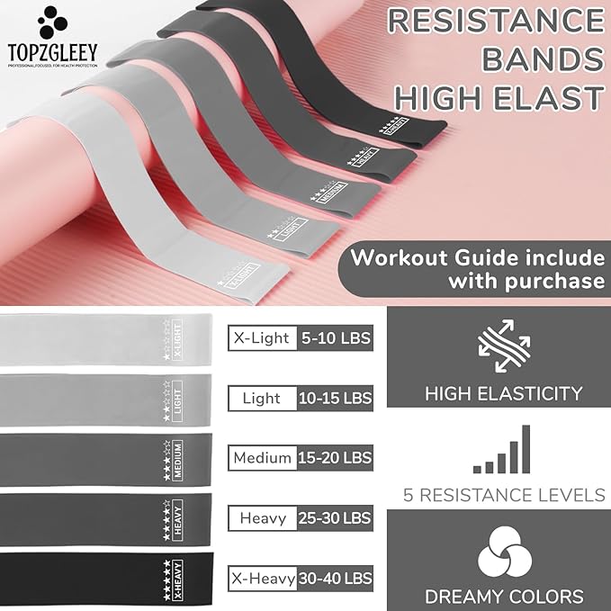 - Multiple Uses High End Exercise Bands; This Resistance Band Set Can Be Integrated Seamlessly With Various Popular Workout Program. Or Use Them For General Exercise, Stretching, Strength Training,Power Weight,More than just a dreamy design, these highly durable latex bands featuring 5 TPE material bands covering five resistance levels from X-Light to X-Heavy (5lbs to 40lbs )for versatile exercises tailored to all fitness levels resistance levels, the perfect addition to Pilates workout.