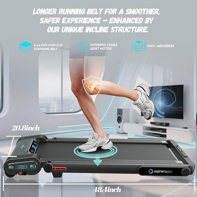 - 🏃♀Wider Running Deck + Advanced Shock Absorbers: Built for comfort and safety, the 15.75" x 39.5" belt is wider than most in its class and paired with 6-layer anti-slip surface, 10 silicone shock absorbers, and 2 cushioning pads to reduce impact on your knees and ankles.