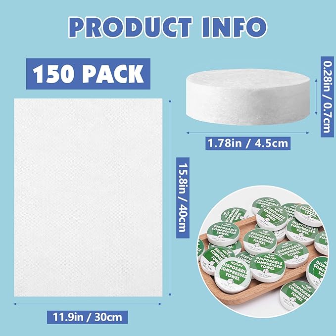 - 【150PCS Compressed Towels】Package includes 150pack disposable compressed towels. Each compressed towel unfolded Size is 11.9in x 15.8in, These compressed face towel are all individually packaged and made of plant fibers. Due to the small size and strong water absorption of compressed coin tissue, there is a risk of suffocation. Children under three years old should not use it alone!