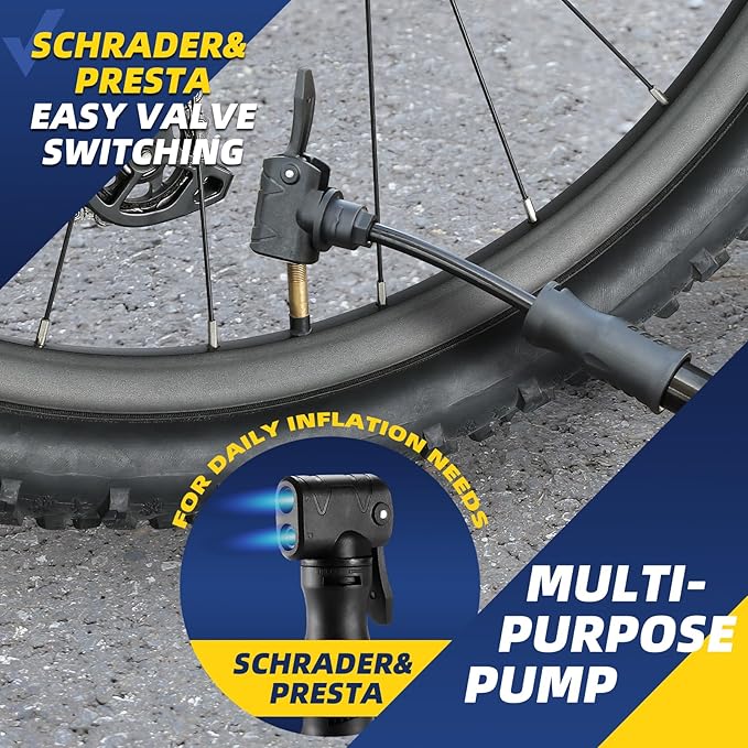 - 【Dual Valve Design】The mini bike pump comes with 2 valves that are compatible with Presta and Schrader valves, allowing you to inflate the tire without changing the adapter. The high strength locking buckle of the cycle pump will not fall off when it is inflated: the pull rod is lifted to lock the air nozzle (at this time you can pump the bicycle tire), and the press is loosened to open the air nozzle, making it more convenient to inflate