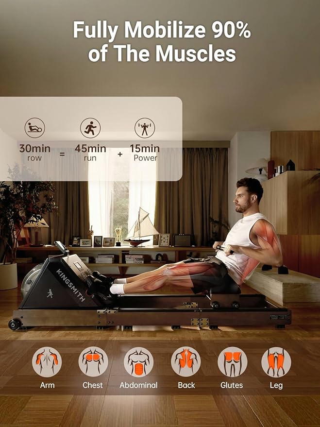 - 【High-Capacity Water Tank – Realistic Resistance】Water rowers make you train like you're on the water! The 6-level adjustable water tank delivers up to 176 lbs of smooth, quiet resistance, powered by 12 precision blades. Adjust water volume to tailor intensity and engage 90% of your muscles with every stroke for a truly immersive workout.