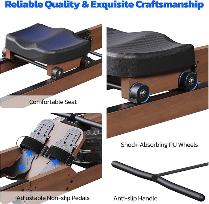 - Immersive Rowing Experience: The rowing machine is equipped with a 14L high quality water tank and you can easily adjust the resistance with 6 different water levels to match your fitness goals, from beginner to advanced.The ergonomic seat and smooth-gliding PU rollers ensure a quiet, comfortable workout, while the stable 125cm dual rails design and the compact size make it ideal for home use