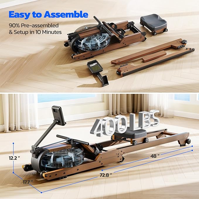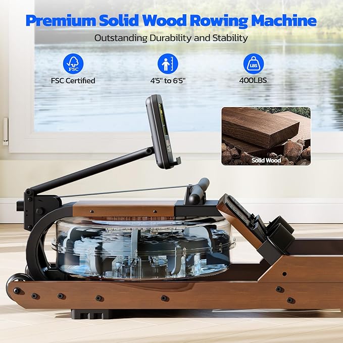 - FSC-Certified Oak Wood Construction: Crafted from FSC-certified premium solid oak, this water rowing machine not only enhances the aesthetic appeal of your home gym but also ensures unmatched durability and stability, supporting up to 400LBS weight capacity. Designed for users up to 6'5'' tall, this rower offers an immersive rowing experience that blends seamlessly into any modern living space