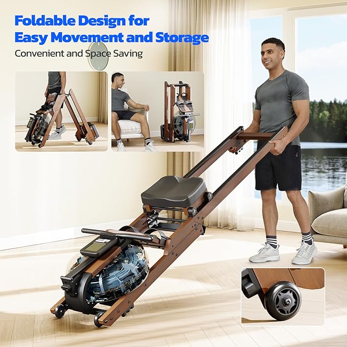 - Foldable Storage Design & Easy to Move: This rowing machine features a new 180° folding vertical storage design and transport wheels, allowing for effortless maneuvering, storage, and usage even in tight spaces. In addition, this water rower features patented sealing technology so it doesn't need to be drained after use and won't leak when stored upright