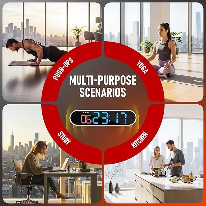 - 【Multi-Functional Gym Time】] Built with 7 ready-to-use training modes (TABATA, MIIT, HIIT, EMOM1/2, FGB1/2, Countdown/Up, Stopwatch) plus 10 fully customizable intervals, this gym timer adapts to every workout style. With a 12/24H clock, daily alarms, and professional-grade training functions, it’s the ultimate partner for intense sessions or everyday fitness