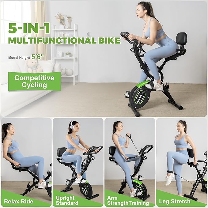 - 5-IN-1 Folding Exercise Bike: This bike allows you to exercise in both upright and semi reclining positions, whether you want to burn more calories or enjoy a relaxed and comfortable riding experience. In addition, the bicycle is also equipped with an arm resistance band, which helps to exercise your upper muscles and relax your leg muscles.