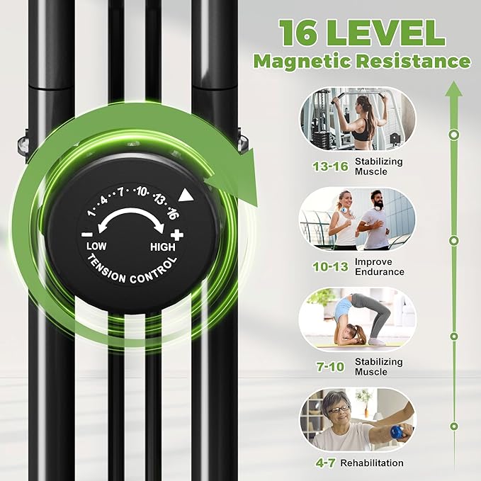 - Quiet & Sturdy: The magnetic resistance keeps fitness bicycles very quiet during cycling, with 16 level gear adjustment to meet your different riding needs. The sturdy heavy-duty steel frame and X-shaped structure provide you with a stable fitness bike, with a support capacity limited to 330 pounds.