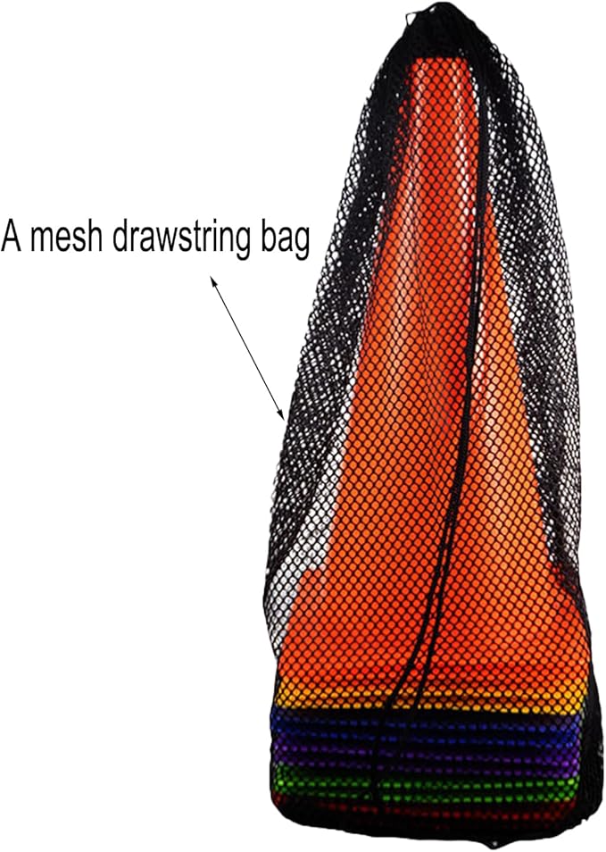 - Size - measures 12 inches in height, 6.7 inches in diameter. Four holes on safety cones for attachment, 1 mesh drawstring bag