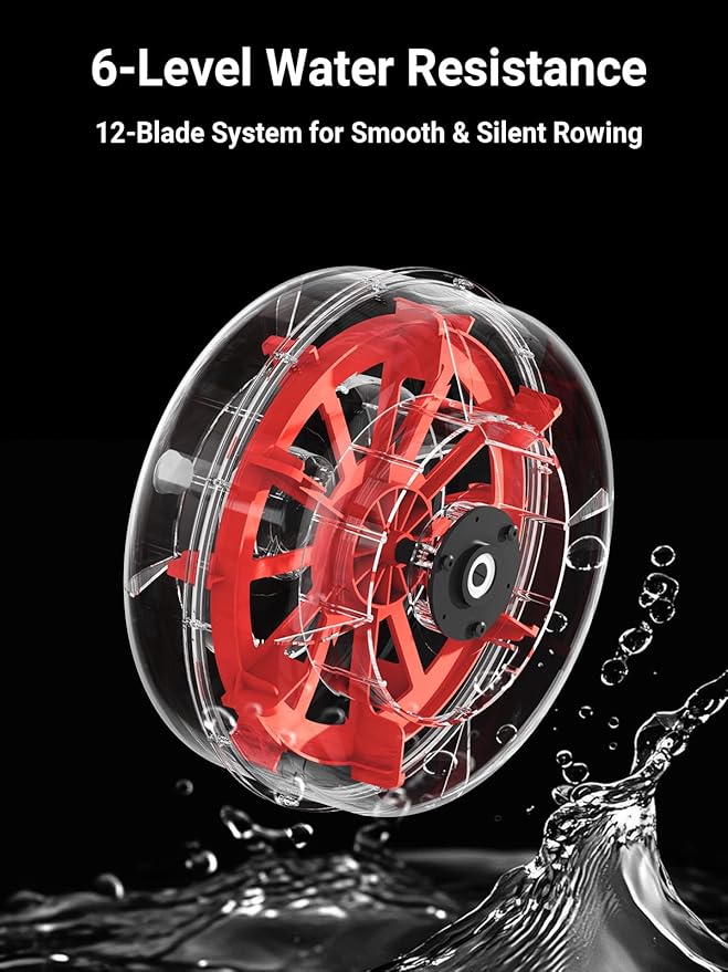 - 【High-Capacity Water Tank – Realistic Resistance】Water rowers make you train like you're on the water! The 6-level adjustable water tank delivers up to 176 lbs of smooth, quiet resistance, powered by 12 precision blades. Adjust water volume to tailor intensity and engage 90% of your muscles with every stroke for a truly immersive workout.
