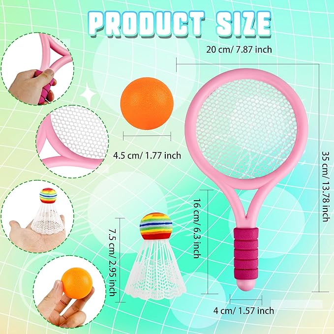 - ✅Size Detail: Each racket measures 35 x 20 cm/ 13.8 x 7.9 inches with a 16 x 4 cm/ 6.3 x 1.6 inch handle, perfectly sized for little hands. Tennis balls are 4.5 cm/ 1.8 inches and shuttlecocks are 7.5 cm/ 3 inches—great for safe, fun play
