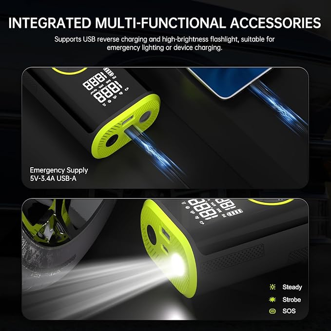 - 【Multi-functional Use】:Come with a built-in 10000mah high-capacity battery. From emergency tire inflation to USB Type-C charging and convenient flashlight mode, this compact motorcycle tire inflator covers every need—ideal for outdoor adventures, road trips, or as a reliable car accessory for men and women.