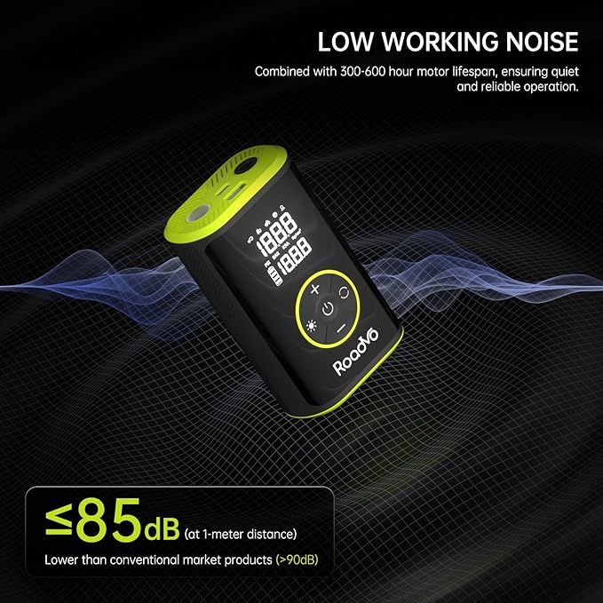- 【Safety & Precision】:Operating at under 85dB, equipped with high-accuracy sensors and overcurrent protection (5-8A), this portable bike pump ensures safe operation, preventing overheating and damage during use on cars, dirt bikes, or as a car accessory.