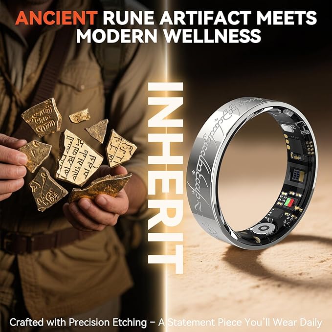 - 【Mystic Runes × Smart Wellness Tracking】Ancient runes meet modern tech. This IP68 waterproof smart fitness ring features deeply etched runes, blending timeless style with advanced tracking. Unisex design discreetly monitors daily activity, rest, and movement—syncs instantly to your phone via Bluetooth. Whether you need a fitness tracker ring, sleep tracker ring, or unique anillo inteligente, it adds purpose and mystique to every day, even through hand washes or light rain.
