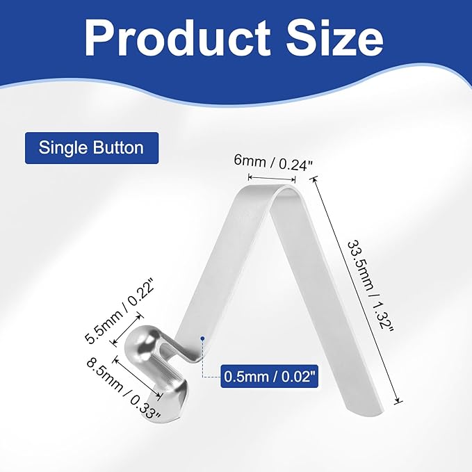 - Size - The size of these kayak paddle spring snap clips is 0.5mm / 0.02" shrapnel thickness; 33.5mm / 1.32" shrapnel length; 6mm / 0.24" shrapnel width; 5.5mm / 0.22" button diameter; 8.5mm / 0.33" button length