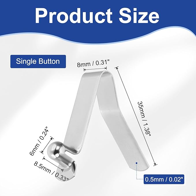 - Size - The size of these kayak paddle spring snap clips is 0.5mm / 0.02" shrapnel thickness; 35mm / 1.38" shrapnel length; 8mm / 0.31" shrapnel width; 6mm / 0.24" button diameter; 8.5mm / 0.33" button length