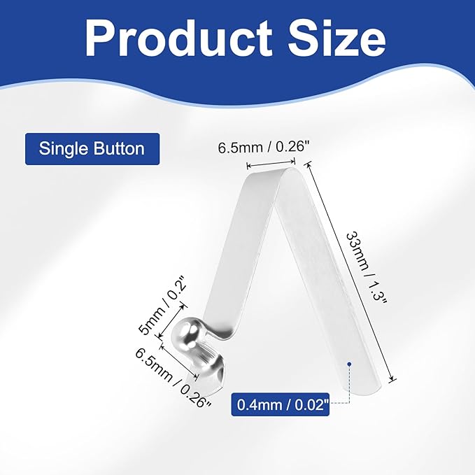 - Size - The size of these kayak paddle spring snap clips is 0.4mm / 0.02" shrapnel thickness; 33mm / 1.3" shrapnel length; 6.5mm / 0.26" shrapnel width; 5mm / 0.2" button diameter; 6.5mm / 0.26" button length