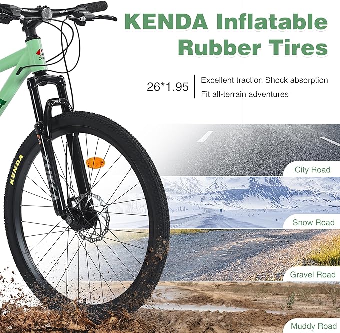 - 【All-Terrain Tires Adapt to various terrains】knobby tires offer excellent traction on dirt roads, gravel, and rocky paths, making it an ideal mountain bike for adults.Made of high quality rubber, all-terrain tires with strong puncture ressistance soften the bumps strong grip, have a super excellent anti-skid function and is not easy to slip.