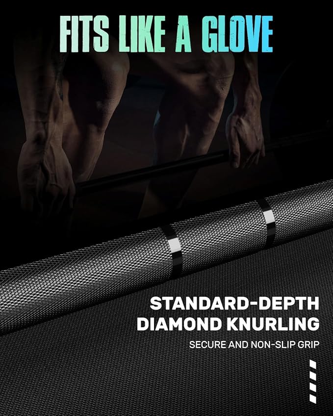- 【Grip. Lift. Dominate.】The barbell adopts a dual-marking knurl design, clearly indicating the correct grip positions for both powerlifting and Olympic weightlifting. The 1.2mm diamond knurling on the surface not only ensures a secure grip but also mitigates the impact of sweating, preventing a drop in friction.