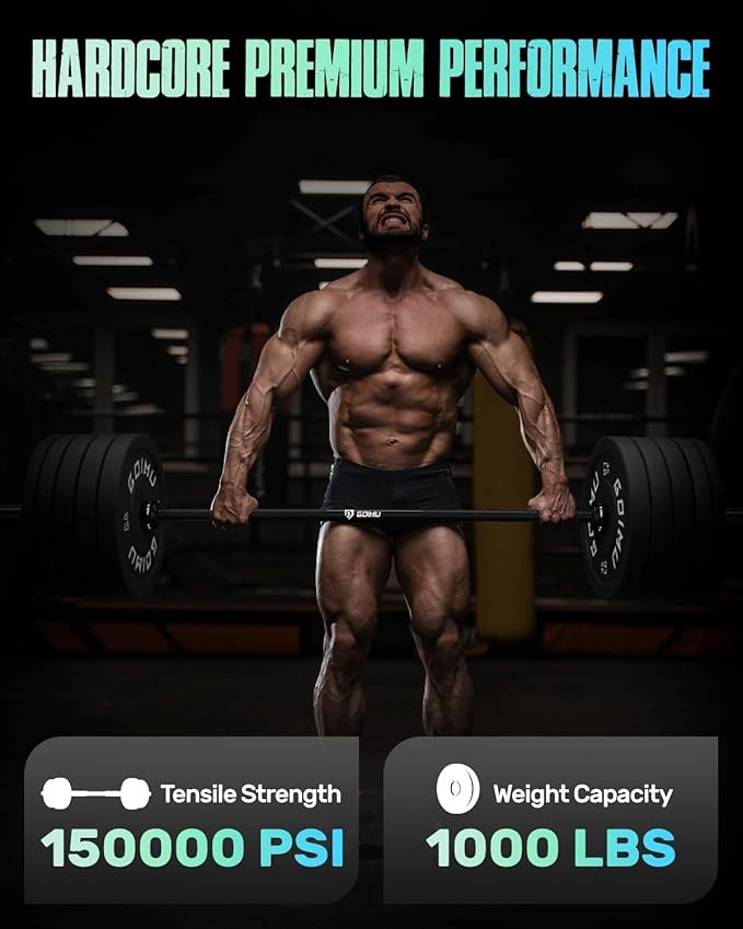 - 【Grip. Lift. Dominate.】The barbell adopts a dual-marking knurl design, clearly indicating the correct grip positions for both powerlifting and Olympic weightlifting. The 1.2mm diamond knurling on the surface not only ensures a secure grip but also mitigates the impact of sweating, preventing a drop in friction.