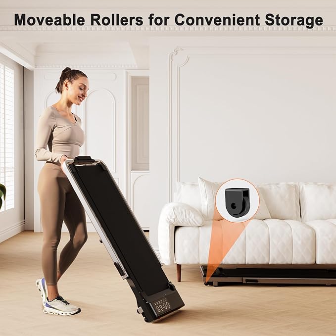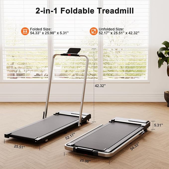 - Folding Treadmill for Small Spaces : The foldable treadmill design is a great space-saver, especially for those with limited living space. You can easily fold it up and store it away when not in use, freeing up floor space for other activities. The small treadmill folded height is only 5 inch makes it effortless to store in any place, even under the bed or sofa, occupying a minimal amount of space