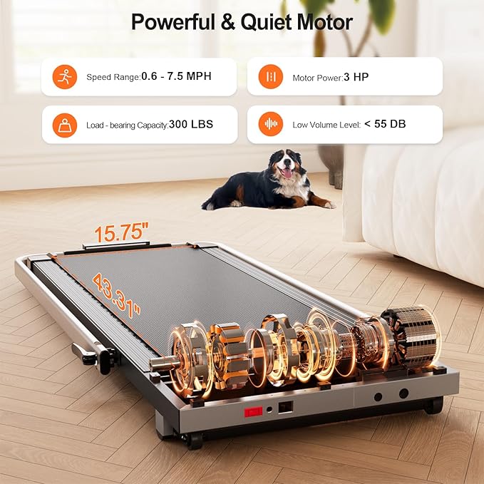 - Treadmill 3.0 hp : The under desk walking pad treadmill is equipped with a quiet 3.0HP motor and has a maximum weight capacity of 300 pounds.The quiet motor of this foldable treadmill operate lower 55 dB and a maximum speed of 7.5mph , you donβt have to worry about disturbing others while exercising