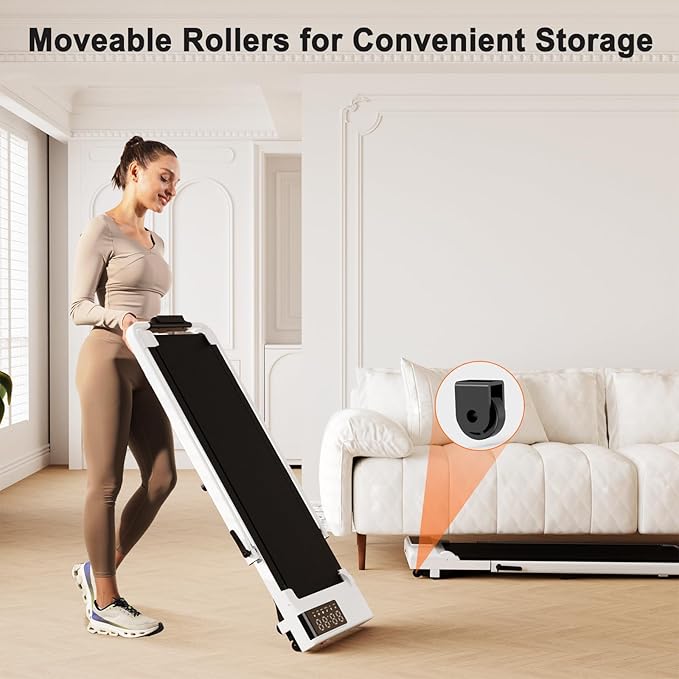 - Folding Treadmill for Small Spaces : The foldable treadmill design is a great space-saver, especially for those with limited living space. You can easily fold it up and store it away when not in use, freeing up floor space for other activities. The small treadmill folded height is only 5 inch makes it effortless to store in any place, even under the bed or sofa, occupying a minimal amount of space