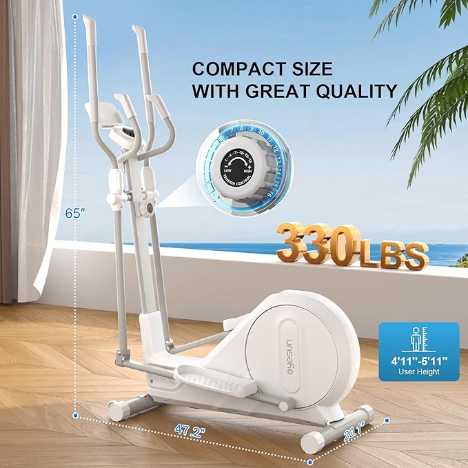 - SPACE-SAVING, DURABLE, AND EASY TO MOVE: Built with a heavy-duty steel frame and 330 lb capacity,this portable elliptical is made to last.Compact footprint (47"x20"x65") fits in any room and saves 20% more space than typical foldable ellipticals.Front transport wheels make it easy to relocate or store.