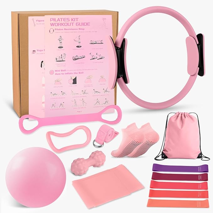 - BEGINNER ALL-IN-ONE PILATES KIT: The pilates equipment set includes a 12-inch Pilates ring, 5 levels loop resistance bands , a 9.8-inch Pilates ball, a 1.5-meter elastic band, an figure 8 resistance band, a 1.8-meter yoga strap, and an arm stretcher. In addition to these essential workout tools, we also provide a massage ball and yoga socks as accessories to help you build muscle, enhance flexibility, sculpt your body, and achieve a fitness transformation.