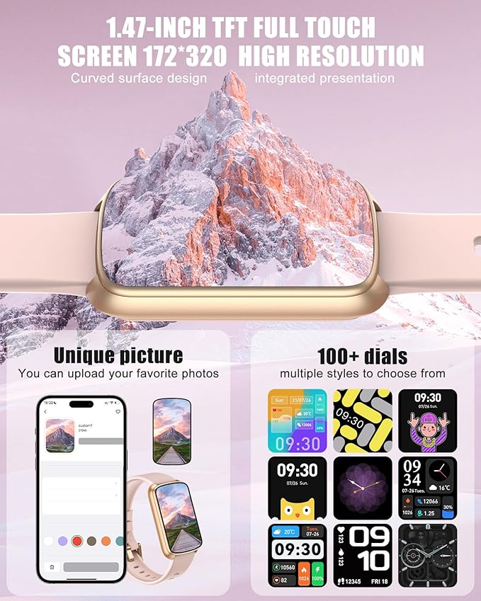 - 【1.47" Touchscreen & 200+ Dials】Enjoy a crystal-clear 1.47-inch TFT display with brilliant clarity and responsive touch control. The GloryFit app offers over 200 stylish watch faces, plus the option to upload your own photo for a personalized look. This feature-rich display seamlessly combines advanced functionality with custom style, elevating your smart watch experience.