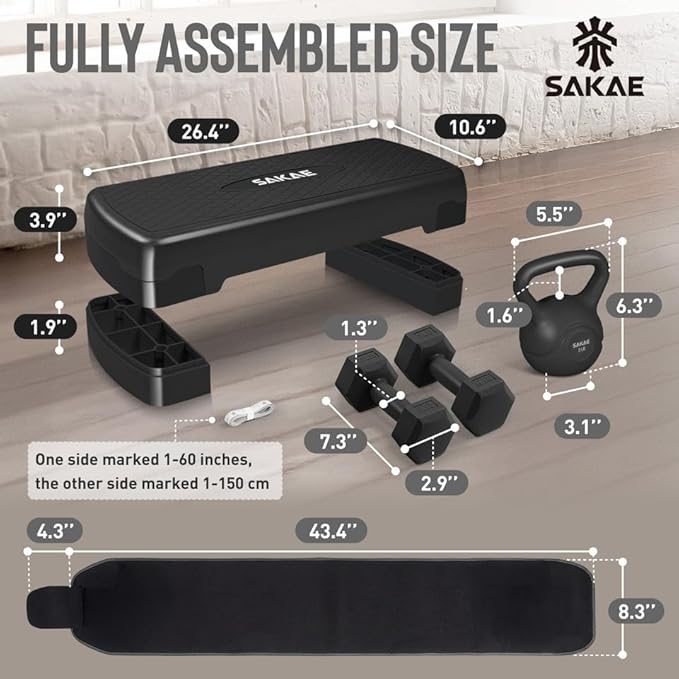 - Multi-Purpose Workout Set: Stepper increases endurance and supports fat-burning routines; includes two 2 LB dumbbells, a 3 LB kettlebell, and a weightlifting belt to add resistance and build strength; measuring tape helps track your fitness progress