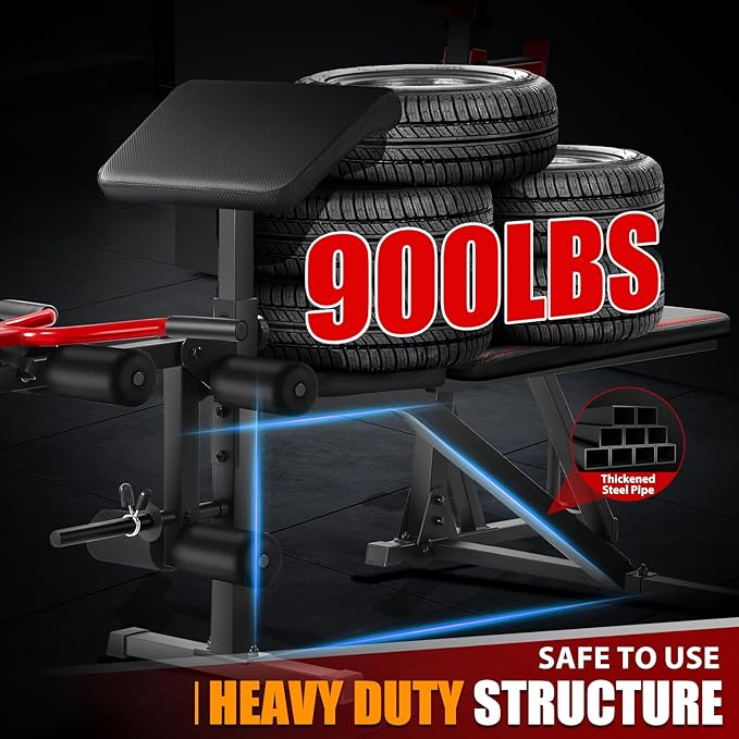 - 【Heavy Duty 900LBS - Years of Workout】Outstanding stable base and sturdy frame is attributed to strictly controlled high-quality steel, as well as carefully-designed triangular structure, which enables it to carry a load capacity up to 900LBS, high wear-resistant leather, sweat-proof, tear-proof, widened and thickened cushion better fit the body shape and bring an excellent longevity. You Need A Durable Bench, Not A One-month Bench.