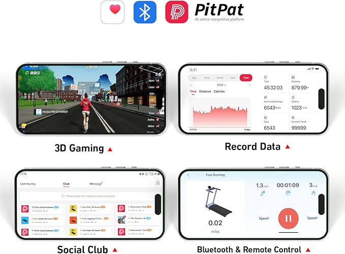 - Track Progress Across APP: Follow Pitpat on your phone or tablet, interact and compete with friends online, there are tons of great single player minigames and more. In order to enjoy these features more fully and get a better workout in the same amount of time, you will need to download and activate the app before using the treadmill.
