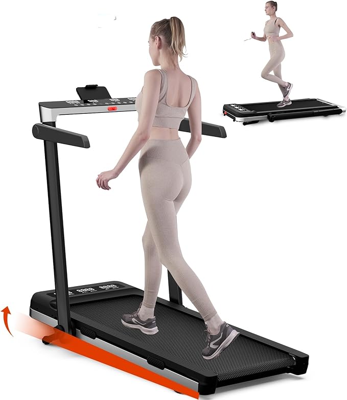 - Compact Treadmill: The adjustable handrail provides optimal stability during running or walking, with a safety lock mechanism to prevent accidental folding for users of all ages and abilities. A foldable handle and smooth-rolling wheels help the machine store flush against walls or under beds, making it perfect for apartments and small homes.