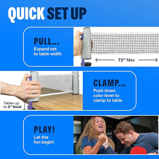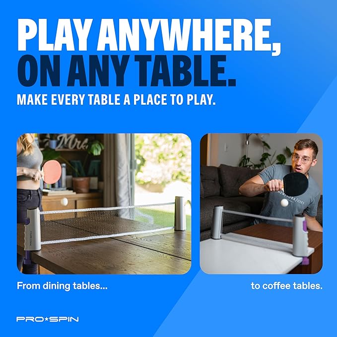 - PORTABLE TABLE TENNIS NET - Turn any table into a ping pong table with our retractable net. No need for a full-size ping pong table! Versatile and lightweight, enjoy ping pong fun wherever you go. Experience thrilling matches and friendly competitions on any table, anytime!