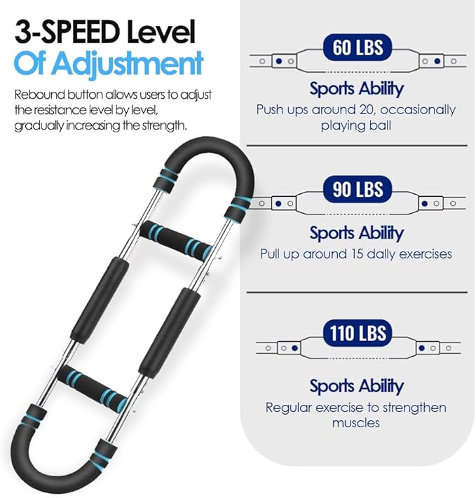 - 【Adjustable Intensity for All Fitness Levels】Featuring three adjustable (60-110 lbs) intensity levels, the chest exerciser for men caters to users of all fitness levels. Builds chest, arms, shoulders, and back safely. Ideal arm trainer for men seeking strength and twister arm trainer for women aiming for tone. Perfect for home gym, office, or travel workouts.