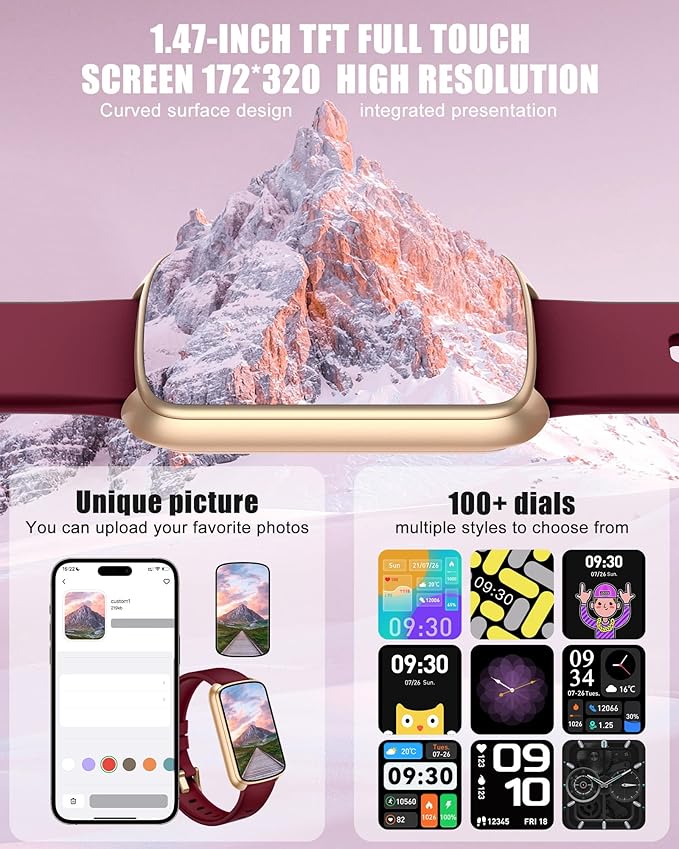 • 【1.47" Touchscreen & 200+ Dials】Enjoy a crystal-clear 1.47-inch TFT display with brilliant clarity and responsive touch control. The GloryFit app offers over 200 stylish watch faces, plus the option to upload your own photo for a personalized look. This feature-rich display seamlessly combines advanced functionality with custom style, elevating your smart watch experience.