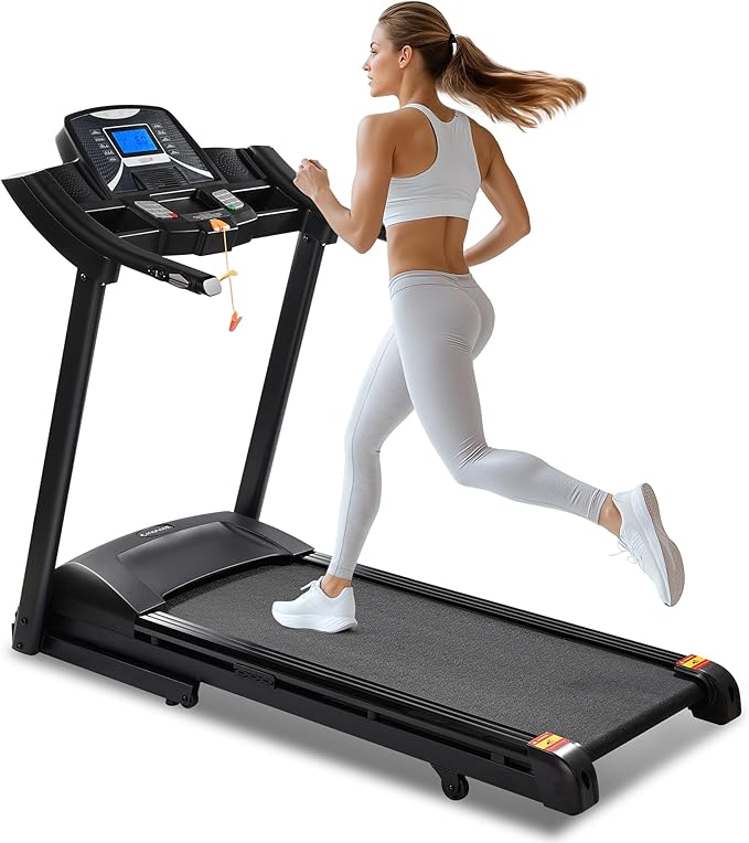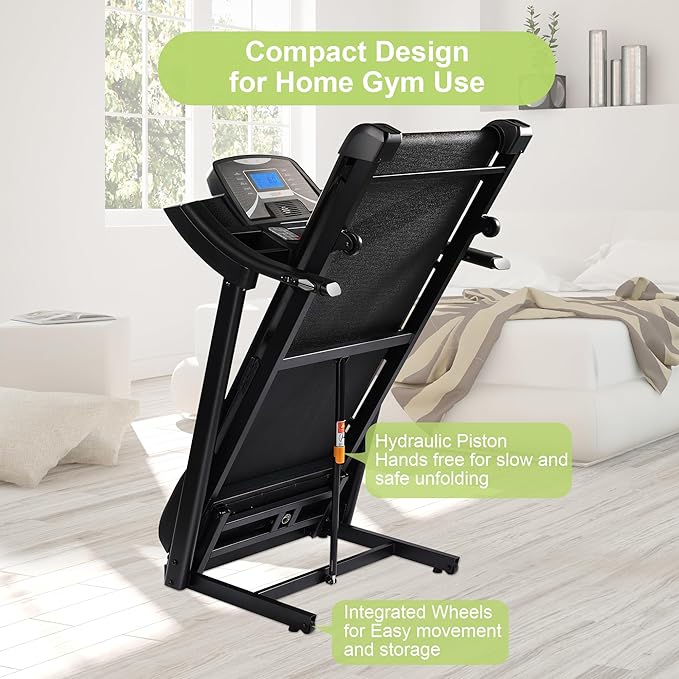 - 【Easy Assembly & SpaceSaver Design】95% completely assembled foldable treadmill is perfect for those who have limited space in their homes. Simply lift the deck and use the transportation wheels at the front to move it from room to room, or store it away out of sight to save space for you.
