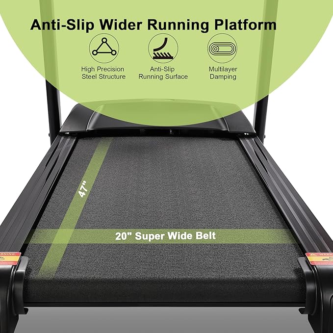 - 【Enlarged Anti-Slip Shock-Absorbing Deck】Longer and wider 47"×20" treadmills can better fit different users' lengths, allowing you to run more freely and comfortably. The multi-layer shock-absorbing deck provides an effective cushion for your knees and muscles, further reducing unwanted noise.