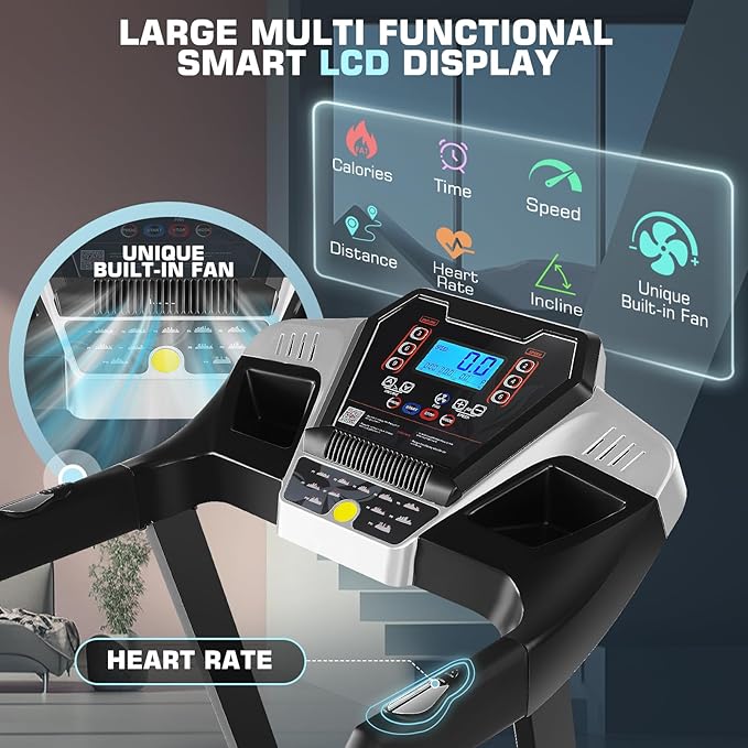- 【Multi-function Large LCD Console & APP Control】The large central console provides you with all the information you need while running, including speed, time, distance, calories burned, and heart rate. You can also use the fitness app to simulate different types of outdoor running scenes to add fun to your workout.
