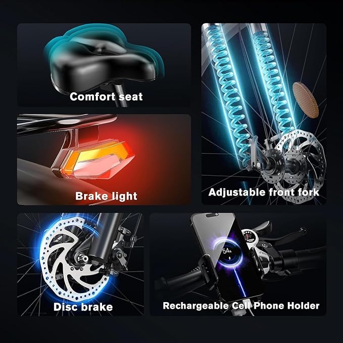 - 【Features and Accessories】This 27.5" tire electric bike is designed with a high-strength frame for enhanced durability. The adult bicycle is equipped with an ultra-bright LED headlight and taillights featuring left and right turn indicators, ensuring visibility and safety during night rides. Additionally, the bike comes with a rear rack, mudguards, and an adjustable seat to accommodate the needs of most riders