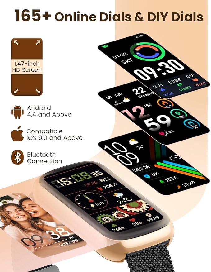 - [2 Watch Bands, 165+ Watch Faces] The sporty silicone band and the exquisite metal band can match any clothes in your wardrobe, making you very charming no matter what occasion. 165+ watch faces are available for you to choose, and you can also customize your unique dial with your favorite photos. The combination of 14.5g ultra-light body and 1.47-inch high-definition screen brings the ultimate user experience to people who wear this fitness watch.