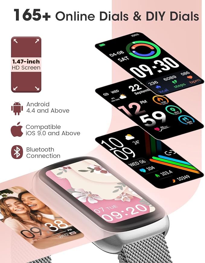 - [2 Watch Bands, 165+ Watch Faces] The sporty silicone band and the exquisite metal band can match any clothes in your wardrobe, making you very charming no matter what occasion. 165+ watch faces are available for you to choose, and you can also customize your unique dial with your favorite photos. The combination of 14.5g ultra-light body and 1.47-inch high-definition screen brings the ultimate user experience to people who wear this fitness watch.