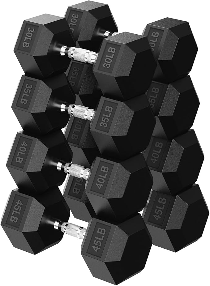 - Premium Rubber Encasement: Include a pair of ( 30 lb 35 lb 40 lb 45 lb ) hex dumbbell weight made from solid cast iron cores and virgin rubber coating, these dumbbells resist cracking and fading while protecting both your floors and equipment. The durable rubber shell absorbs impact for quieter workouts.